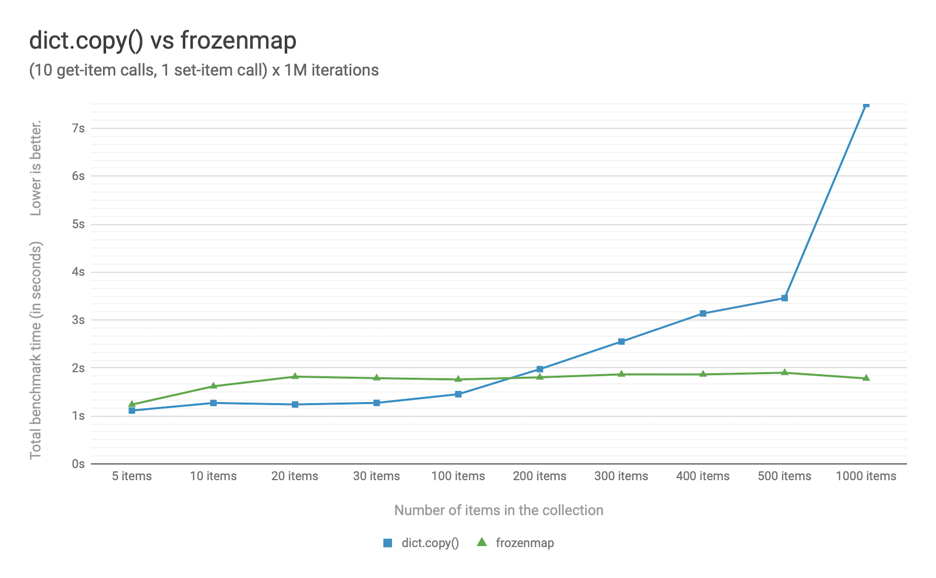 • frozenmap implemented with HAMT displays near O(1) performance for all benchmarked dictionary sizes.